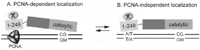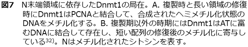 N末端約290 アミノ酸残基からなる配列には、複製に必須なPCNA (proliferating cell nuclear antigen)30)、転写抑制因子DMAP1 (Dnmt1 associated protein)31)、DNAに結合する配列がある32)。PCNAは複製フォークに結合してDNAポリメラーゼやDnmt1などを結合するプラットフォームとして機能するが、この配列と重なるようにしてDNA結合配列が存在する。このDNA結合活性はATに富むDNAの狭い溝に結合し、PCNAへの結合と競合する。ATに富む配列内のCpGは多くの場合メチル化修飾を受けていることから、N末端付近に存在するDNA結合配列は、PCNAを要求しない短い塩基除去修復箇所にDnmt1をリクルートするために働いていると推察される32) (図7)。このN末端領域は、ヘミメチル化CpGを認識してメチル化する触媒活性には影響を与ないことを考えると33)、Dnmt1分子の局在を制御し、機能を調節する因子をリクルートするプラットフォームの役割を担っているのであろう。