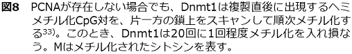 Dnmt1はメチル化模様の維持に中心的な役割をはたす。したがって、Dnmt1がヘミメチル化CpGを特異的に認識する機構の解明が最も重要な問題であるが、これについては現在のところほとんど解明されていない。メチル化模様を維持するためにはもう一つ、複製が終了した娘鎖上のヘミメチル化CpGをDnmt1は順次メチル化する性質が必要となる。Dnmt1はN末端領域でPCNAと結合することによって複製鎖上をDNAポリメラーゼなど複製因子複合体とともにスライドして、合成されたばかりのヘミメチル化CpGを順次メチル化していくモデルが考えられている。しかし、我々の結果では、結合配列を含むN末端領域を欠くDnmt1でも、DNA2本鎖の片一方の鎖をスキャンして、遭遇するヘミメチル化CpGを順番にメチル化する性質を保持していた (図8)33)。したがって、この特性は複製フォーク上でPCNAと結合することに依存したものではなく、酵素自身が持っている性質であるといえる。