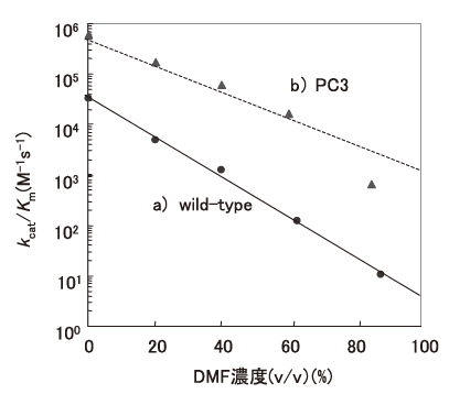 この最初の例は、1993年のChenとArnoldによる図1にも示したsubtilisin EのDMF中での活性の改変である2)。この論文ではsubtilisinの酵素遺伝子をエラー-プローンPCRにより変異し、DMF中で活性が高い変異酵素を順次選抜し、それらの変異を順次組み合わせ蓄積させてPC3を得たものである。変異酵素のスクリーニングは、DMFを含むカゼインプレートでのハローの大きさという簡便な方法が採用されている。最終的に得られたPC3変異酵素は、図1のbに示した反応性を示した。端的に言えば、酵素の活性が上昇し、0~85%のDMF濃度の全範囲でkcat/Km値が上昇している。また、DMF濃度が上がるにつれて顕著であるkcat/Km値の減少が、緩やかになっている。表3にそれらの結果をまとめたものを示したが、特に著しいのは、野生酵素と比較した場合のKm値の減少である。このように、「DMF中で高活性を示す。」という選択圧に対して、酵素遺伝子は、野生酵素と比較して「DMF中でのKm値を下げ、kcatを上げる。」という進化分子工学的な方向性で答えたのである。PC3は10個の変異点を有している。これらは活性中心や基質結合部位に近い蛋白質表面のループ構造に集中して存在しているが、構造学的にこれらの変異点を予想したり、野生酵素とPC3の構造的差異を示すデータは得られていない。MooreとArnoldはp-nitorbenzyl esteraseのDMF中での改変も行っている15)。この場合は基質特異性を変えるという選択圧も同時に加えられているが、最終的にはターゲット基質に対して、15%DMF中で野生酵素と比較してkcat/Km値が約25倍向上した変異酵素が得られている。この場合はKm値の減少よりも、kcatの上昇が著しい。