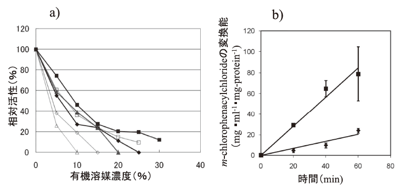 「有機溶媒耐性」という言葉については、専門家でも幾らか誤解があるようである。実は、酵素触媒の水-極性有機溶媒中での安定性 (有機溶媒中での蛋白質としての安定性) の指標である半減期τ (時間) と有機溶媒中での酵素触媒の活性 (kcat) とは時に別物であり、これらを分けて考える必要がある。