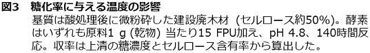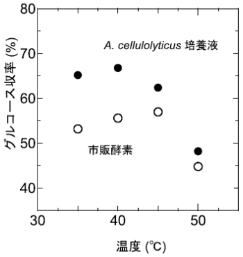 セルラーゼは複合成分からなり、それらのセルロースの分解機構には諸説あるが、大枠で、エンド型の酵素であるエンドグルカナーゼ (EG)、エキソ型の酵素であるセロビオヒドロラーゼ (CBH)、そしてβ-グルコシダーゼの3成分の作用でグルコースまで分解すると言われており、セルロースをグルコースまで分解するには、これらの成分がバランスよく含まれた酵素を使用することが望ましい。開発を進めている酵素メーカー2) による安価で活性の高い酵素の登場が期待される一方で、当社では設備内での生産を想定した検討も行っている。セルラーゼ生産菌はTrichoderma属、Aspergillus属などの糸状菌に高い生産能を示すものがあり、特にTrichoderma属菌については数多くの研究が行われているが、工業技術院 (現在の独立行政法人産業技術総合研究所) が国内で単離し開発したAcremonium cellulolyticusという糸状菌に注目した。A. cellulolyticusが生産するセルラーゼはTrichoderma属菌のセルラーゼに比べてオリゴ糖をグルコースまで分解するβ-グルコシダーゼが強いという特徴を有しており、グルコースを発酵用基質として利用するバイオエタノール製造用の酵素生産菌として好ましい性質を持つ3,4)。産業技術総合研究所、静岡大学と共同で菌株の改良ならびに培養条件の検討を進めており5,6)、現在のところ、50-L規模の培養で酵素のろ紙分解活性として15 FPU/mL (5日) 位に達している。これはTrichoderma属菌の培養で論文として報告されている生産性よりも概ね高い。また、実際に前処理した建設廃木材の糖化性をA. cellulolyticus培養酵素と市販酵素 (Trichoderma属菌由来) で比較したところ、FPUとして同量添加したときの35~40℃でのグルコース収率はA. cellulolyticusの酵素の方が約2割高く (図3)、酵母による発酵温度域での糖化力が優れていることが示唆された。培養生産と酵素糖化反応の最適条件を引き続き検討しているが、A. cellulolyticusは高い酵素生産力を持つとともに、その酵素は実用的な糖化発酵プロセスに適した性質であると考えられる。