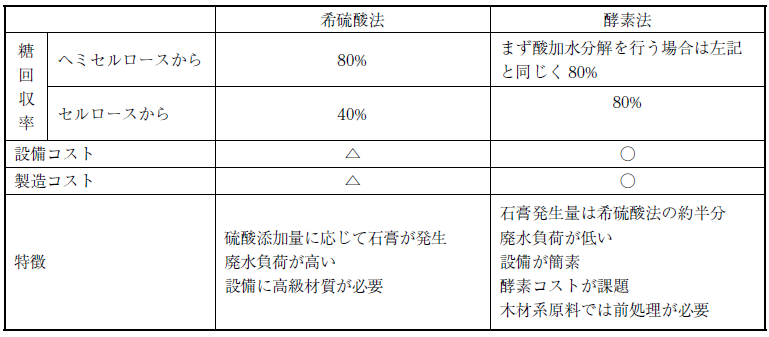建設廃木材を対象とした酵素法プロセスでは、酸加水分解残渣に対してまず前処理を施す。これは建設廃木材を主に構成する針葉樹の場合、酸加水分解でヘミセルロースを抽出しただけでは酵素糖化が良好に進まないためである。前処理の目的はセルラーゼのアタックを妨害するリグニンの除去や結晶化度の低減などであり、各木質系バイオマスについて物理的、化学的、生物的方法がそれぞれ研究されているが、例えば当社が検討している微粉砕処理は、リグニンは除去されないが結晶化度の低減や比表面積の増加には効果があり、所要動力も原料を直接微粉砕するよりは小さい。続く酵素糖化では、セルラーゼの反応条件と酵母の発酵条件が近いため単一の槽で糖化発酵を行う (同時糖化発酵または並行複発酵と呼ばれる) 方式が一般的である。酵素は設備内で生産して精製と輸送を省略するという考えを取り入れる予定である。