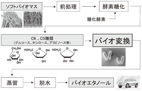 ソフトバイオマスからのバイオエタノールの生産は、2つの要素技術から構成される (図1)。すなわち、糖類生成工程と、糖類からエタノールへのバイオ変換工程である。前者は使用する酵素 (セルラーゼ) のコストが鍵であり、酵素の改良や、大規模生産により大幅なコストダウンが見込まれている。従って、バイオ変換工程の確立が技術課題となる。
