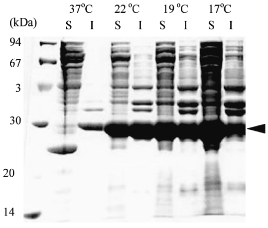 S-体のシアノヒドリンを合成する酵素としてトウダイグサ科のキャッサバやパラゴムノキ (Hevea brasilliensis) 由来の (S)-HNLが知られているが、いずれも植物組織中の含量が少なく、工業利用するためには組換え系を使った大量生産法の開発が必要であった4,5)。筆者らは、キャッサバ由来のMeHNLを組換え大腸菌を用いて大量生産する方法の開発を行った6)。キャッサバからクローニングした天然型のMeHNL配列を大腸菌pETシステムで発現を行ったところ、発現量はごくわずかであった。そこで、レアコドンの改変を行い、コドン使用頻度を大腸菌型に改変した結果、酵素発現量を増大させることができた。しかし、活性を示す可溶型MeHNLの量は、生産されたMeHNLのうちごくわずかであり、ほとんどが活性の無いインクルージョンボディとして生産されていたことがわかった。そこで、インクルージョンボディ形成を抑制するための手段として、低温培養を試みた。
