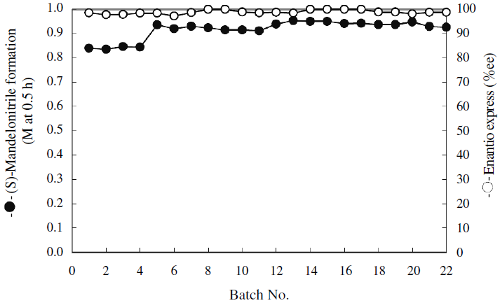 固定化MeHNLを用いた (S)-マンデロニトリルの繰返し回分反応の結果を図5に示した。本固定化酵素は反応速度および光学純度の低下なしに20回以上の回分反応が実施できた。