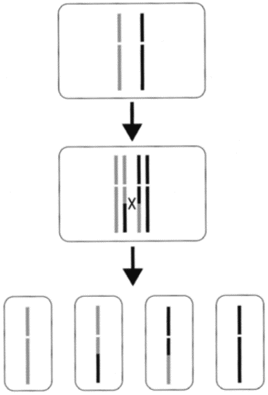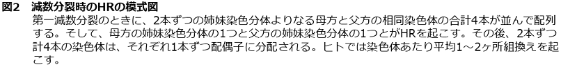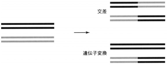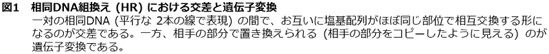 HRは、DNAの塩基配列がよく似た部位 (相同部位) で起こる組換えである。このHRによって、一対の相同DNAの間で、お互いに塩基配列がほぼ同じ部分を相互交換した形になるのが交差で、一方の相同DNAの部分が、相手の塩基配列がほぼ同じ部分で置き換えられる (相手の部分をコピーしたように見える) のが遺伝子変換である (図1)。HRは減数分裂時には高頻度で起こっており、このHRがうまくいかないと配偶子が形成されない (図2)。また、ニワトリ、ウサギ、ウシなどのBリンパ細胞の抗体遺伝子座では、HRによって複数個ある鋳型遺伝子配列の一部が、活性化している対応する遺伝子座の配列と置き換わること (遺伝子変換: gene conversion) によって、抗体遺伝子可変領域の一次構造が多様化する (Ig gene conversion)。たとえば、ニワトリの抗体軽鎖遺伝子は、VλJλとその上流領域に存在する25個のΨVλよりなる。HR (遺伝子変換) によって、VλJλの塩基配列が、対応するΨVλ中の塩基配列に置換される (図3)8,9)。