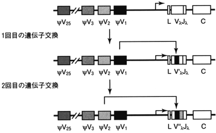 図3 ニワトリ抗体軽鎖遺伝子でのHRによる多様化の例