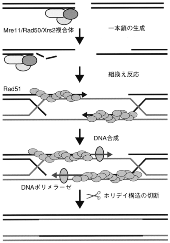 様々な化学物質や放射線により切断されたDNAの修復や、損傷によるDNAの複製の阻害の回避においてもHRが重要な役割を果たしていることが知られている1)。このようにHRは生物界で普遍的な現象で、それに働くタンパク質は細菌からヒトまで機能、構造ともよく保存されており、DNAの修復や減数分裂時のHRには多くの共通の分子が関与することが解明されている。これまでにわかっている酵母のHRの分子機構を放射線によるDNAの二重鎖切断の修復を例にして模式的に示したのが図4である。二重鎖断裂の結果生じた末端がMre11複合体の関与する反応によって処理され、一本鎖が形成される。この一本鎖DNA上にRPA、Rad51、Rad52などの分子が結合し、このDNA/タンパク質複合体が、相同な塩基配列を持つ別のDNAをサーチ (ホモロジーサーチ) する。そして、DNA/タンパク質複合体が相補的な塩基配列と対合し、ヘテロ二重鎖を形成し、DNA/タンパク質複合体のDNA 3’末端より相補的塩基配列を鋳型としたDNA合成が始まる。出来上がった二つの二重鎖がエンドヌクレアーゼにより切断され解離し、反応が完結する。多くのHRに関与する因子が、大腸菌、酵母、動物細胞により単離され、分子機構のモデルが提案されているが、いまだ明らかになっていない部分も多い。たとえば、前にも述べたように、ホモロジーサーチ後形成されたヘテロ二重鎖において、どのようなDNAポリメラーゼがDNA合成に関与しているのかはまったくわかっていなかった。我々はこのDNA合成に、TLSを行うDNAポリメラーゼが関与しているのではないかと考え研究を行ってきた。