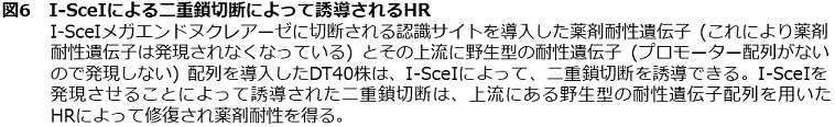 動物細胞が、二重鎖切断の修復をHRによって行う能力をどれだけ持っているかは、以下に説明する細胞内で人工的に二重鎖切断を誘導しその修復能を測定する方法 (図6) によって評価することが出来る11)。I-SceIメガエンドヌクレアーゼの切断認識サイトを導入した薬剤耐性遺伝子 (これにより薬剤耐性遺伝子は発現されなくなっている) とその上流に野生型の耐性遺伝子 (プロモーター配列がないので発現しない) 配列を導入したDT40株は、I-SceIによって、二重鎖切断を誘導できる。I-SceIは普通のエンドヌクレアーゼとは異なり、18塩基配列にも及ぶ長い塩基配列を認識して切断する。したがって、人工的に認識サイトを導入したもの以外は、この酵素によって切断される可能性はないに等しい。I-SceIを発現させることによって誘導された二重鎖切断は、上流にある野生型の耐性遺伝子配列を用いたHR (遺伝子変換) によって修復され薬剤耐性を得る。したがって、薬剤存在下における薬剤耐性細胞のコロニー出現頻度によってこのHR能を評価できる。