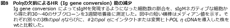 ある一定時間内に、抗体遺伝子可変領域の多様化にかかるHR (Ig gene conversion) がどれだけおきるかを測定する評価法を用いて、Ig gene conversionにおけるpolηの役割を検討した10)。我々がpolηを得るために用いたwtのDT40細胞株は、抗体遺伝子可変領域にグアニン (G) 一塩基分によるフレームシフトを起こしており、sIgMを産生することが出来ない12)。このフレームシフトを持つ領域が、Ig gene conversionによって置き換われば、sIgMを発現するようになる (図7)。よって一定期間の培養中に、sIgMを発現するようになった細胞を、イムノアッセイを利用してカウントすればIg gene conversionを起こす能力が評価できる13)。我々が単離した3株のpolηも上記のようなフレームシフトが保存されていることが確認できた。そこで、wtと3株のpolηについてそれぞれsIgMを発現していない細胞から30~40のサブクローンを得、それらを別々に3週間培養し、それぞれのサブクローンについてsIgMを発現している細胞がどれだけの割合で存在するかカウントした。その結果、polηについては、その割合がwtの1/2~1/6のレベルに減少することがわかった。また、polηにヒトPOLη遺伝子を導入し発現させることによって、割合をwtのレベルに近づけることが出来ることも確認できた (図8)。そこで、Ig gene conversionにpolηのポリメラーゼ活性が実際に必要かどうかを確認するため、2箇所の変異が入ったヒトPOLη遺伝子をpolηに導入し、活性を失ったpolηを発現させ、同様に試験をしてみた。その結果、polηに活性を失ったpolηを発現させても、sIgMポジティブな細胞の割合は低下したまま (図8) であり、Ig gene conversionにおいてpolηはDNA合成に直接関わっていると考えることが出来る。
