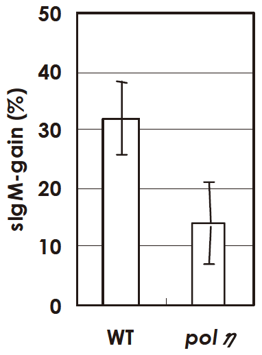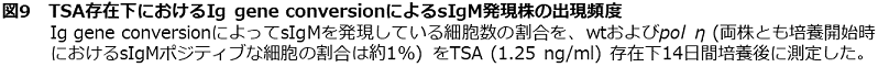 ここで用いた評価法では、wtにおいてもsIgMポジティブな細胞に変化したものの割合は、約1ヶ月間にわたって培養しても1~2%程度の低い値である。ヒストンデアシラーゼインヒビターであるトリコスタンチンA (TSA) 存在下で培養すると、Ig gene conversionの起きる頻度を約50倍上げることが出来ることがわかっている14)。そこで、同様な評価法をTSA存在下で培養することによって行ったところ、図9に示したようにwtに比べpolηの場合sIgMポジティブな細胞に変化したものの割合が減少することを確認することが出来た。