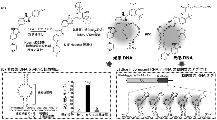 上述の通り、"光るRNA" を構成する機能性蛍光色素は、標的RNA配列に対する結合に伴って初めて蛍光量子収率を増大させるのみでなく、細胞膜透過性、生体直交性、低細胞毒性などの生細胞応用に必須となる項目も満足させる必要がある。本点は配列特異性の付加などに比べ、合理的設計による実現が非常に難しい部分であり、大きな問題となる。マラカイトグリーン/RNAタグ配列ペアなど可能性のある候補ペアは幾つか報告されているが10-13)、現状では実際の生体反応モニタリングを可能にした例はない。一方、現在細胞内核酸染色に使用されている蛍光色素群は、長期にわたる研究の結果得られたものであり、上記の点も克服済みである。我々はこのような優れた生細胞染色蛍光色素群を改変し、目的とする "特定の核酸タグ配列/構造に結合した場合にのみ蛍光を発する機能性蛍光色素" へと進化させる戦略を構築した5,6)。詳細は省略するが、Step1:分子モデリングに基づく環境応答性蛍光色素の化学修飾ライブラリの創製とStep2:核酸の試験管内進化法による結合核酸配列の探索を利用した有機化学/分子生物学を融合した戦略である。特に問題となるのは、Step2で得られた蛍光色素/核酸タグ配列の蛍光増幅能であるが、色素の周辺微視環境依存性を指標とした光化学的性質と融合させることで、本戦略に基づいたペアの探索を可能とした (図2a)。