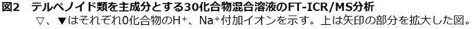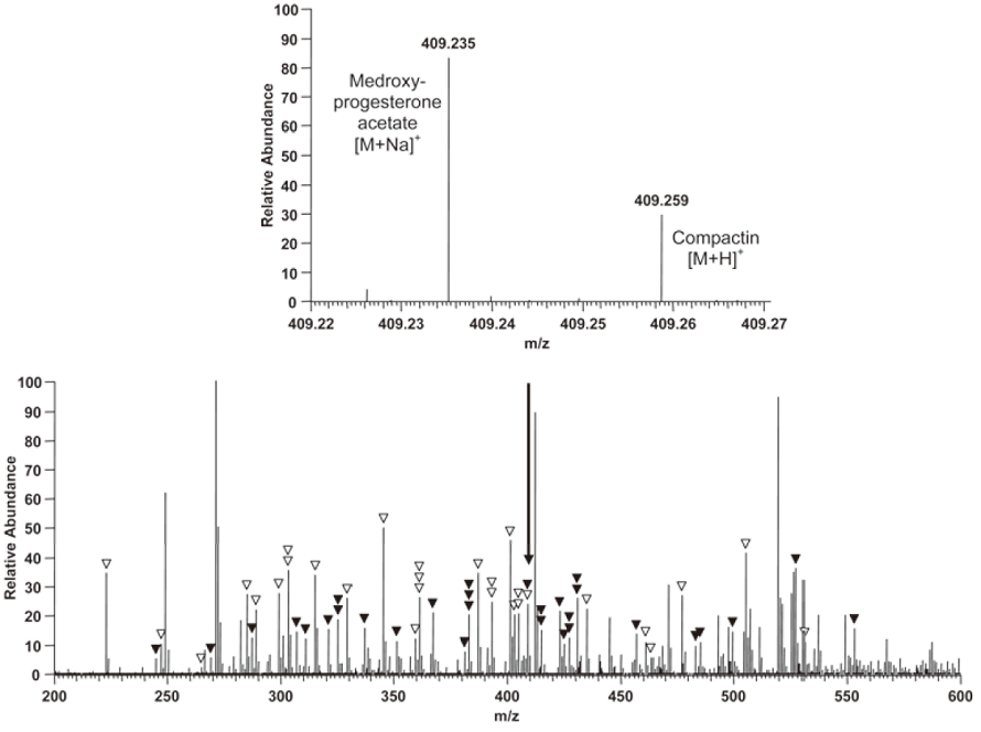 一方、テルペノイド類を中心とする市販化合物を収集し、30化合物 (トリテルペン24化合物、ジテルペン2化合物、セスキテルペン2化合物、ポリケチド2化合物) のモデルライブラリーを作製して基質の探索源とした。その混合溶液 (各濃度3.3µM) を調製し、FT-ICR/MS分析を行った。使用した装置はFinnigan LTQ FT (Thermo社製、磁場強度7T) で、エレクトロスプレーイオン化法、ポジティブイオンモードにより分析を行った。その結果、30化合物のH+付加イオンおよびNa+付加イオンの精密質量数に相当するマスピークを検出することができた (図2)。構造異性体のピークを分離することはできないが、それ以外のピークの分離を確認した。例えば、酢酸メドロキシプロゲステロンのNa+付加イオン (m/z409.235) とコンパクチンのH+付加イオン (m/z409.259) は0.024の質量数差しかないが、ピークは分離していることがわかる (図2)。各成分のピーク強度の違いは主にイオン化効率の違いに起因する。また、アダクトイオン形成や溶媒、装置等由来のコンタミネーションに起因すると思われる未知ピークも検出されたが、これらを含むほとんど全てのピークを分離することができ、精密質量数に基づいて判別することが可能であった。