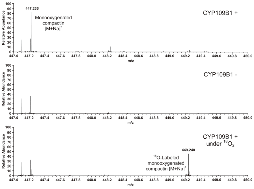 図3 CYP109B1による化合物混合溶液中のコンパクチン酸化のFT-ICR/MS分析