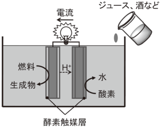 小型電子機器等の電源として、身の回りに分散するエネルギー源を利用した小型発電デバイスが活発に研究されており、そのひとつに、酵素を電極触媒として発電を行うバイオ燃料電池がある (燃料溶液を連続供給しない場合は、バイオ電池と呼ぶのが相応しい)。酵素は、大量生産が可能であるため、安価で再生可能な触媒である。温和な環境で活性を示し、様々なバイオマスを酸化するものが多様に存在する。さらに重要なのは、高度な基質特異性である。原理的には、身の回りに存在する燃料溶液 (例えば、ジュース、お酒、血液など) を、精製せずに直接利用でき、発電セル全体を極めてシンプル・小型に構成可能となる (図1)。このようにバイオ燃料電池は、白金などの貴金属触媒や有機電解液を必要とせず、身の回りの燃料溶液から発電できるため、携帯電子機器や体内埋め込み型電子機器用の使い捨て小型電源としての利用が期待されている。本稿では、バイオ燃料電池の基本構成を、最近の開発動向を交えて紹介する。