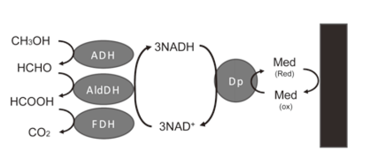 酵素を電極触媒とするバイオ燃料電池では、通常グルコースからグルコノラクトンへの2電子酸化のみで出力を得ている。本来、グルコースであれば1分子から24電子、エタノールであれば12電子をCO2への完全酸化により得ることができる。生体内では多種の酵素反応の連携よってそれを実現しており、その模倣によって、電極上での多電子酸化が可能かもしれない。このような多段階酸化のバイオ燃料電池への適用は、古くはWhitesidesらにより試みられている17)。彼らはアルコール、アルデヒド、ギ酸と三つのNAD依存性脱水素酵素の利用で、メタノールの多段階酸化を実現している (図3)。また最近では、ミトコンドリア内のエネルギー生成回路であるクエン酸回路を電極上で再構成することにより、乳酸やエタノールの完全酸化を行う取り組みがなされている18,19)。その際使用される酵素の大多数はNAD依存性の脱水素酵素であり、こういった面からもNADH酸化電極の汎用性の高さと重要性が伺える。また、Minteerらはこのクエン酸回路の再構成に加え、エタノールの4電子酸化系2) やPQQADH、PQQ-ALDHの基質特異性の低さを利用したグリセロールの完全酸化系にも着手している20)。このような多段階酸化系はエネルギー密度の向上、燃料利用率の向上といった面で重要であり、今後の重点研究課題の一つといえる。
