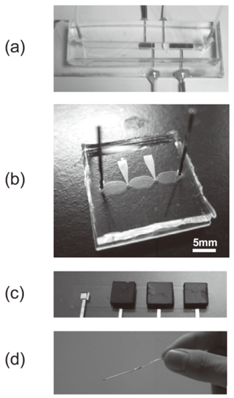 現在のバイオ燃料電池の研究は、主に酵素とメディエータの探索、および固定化法の改良による電極性能の向上に終始しており、電池構造についての報告例は多くない。しかし、バイオ燃料電池の出力性能は格段に進歩してきているため、今後は、より実用に近いバイオ燃料電池の構造も重要な研究課題になると予測される。我々は、そういった視点から半導体作製技術を利用したバイオマイクロ燃料電池を開発してきた (図4)。図4(a)に示したマイクロ流路セルは電池性能の定量評価を行うために有効である9,10)。また、図4(b)のセルを用いることで、バイオ燃料電池を半自動的に直列化することができ、1 V以上の出力電圧を得ることができた21)。さらに耐久性の向上を目指した発電システムや、経皮刺入のための針型バイオ燃料電池についても研究している (図4(c),(d))21)。