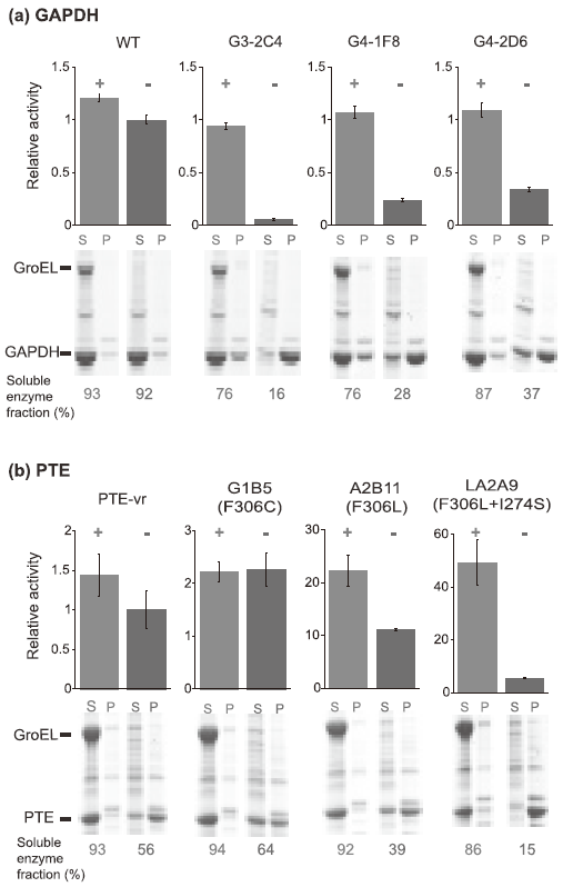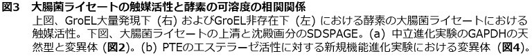 GroEL/ESは酵素の機能進化の側面においても、進化速度を促進する役割を果たすのであろうか。この疑問に対し、我々は、フォスフォトリエステラーゼ (paraoxon) であるPTEを、エステラーゼ (2-naphtylhexanoate) に進化させるモデル実験を、GroEL/ESの大量発現と非発現下の両条件下で行った。すると、GroEL/ES大量発現下では、機能が向上した変異体が非発現下と比較して2倍程度得られた。また、それらの触媒活性は10倍以上向上していることが確認された (図4)。得られた変異体の安定性を調べてみると、GroEL/ES大量発現下で得られた変異体の安定性は軒並み低下しており、GroEL/ES非存在下で変異体を発現させてみると、それらの変異体は凝集する傾向にあることがわかった。これらのことは、GroEL/ESが機能を向上させるが安定性を低下させるアミノ酸変異によるPTE変異体の凝集を防ぎ、機能向上を担保していることを示している。