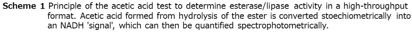 The most frequently used methods are based on photometric and fluorimetric assays performed in microtiter plate (MTP)-based formats in combination with high-throughput robot-assistance. They allow a rather accurate screening of several 10 000 variants within reasonable time and provide sufficient information about the enzymes investigated, i.e. activity by determining initial rates or endpoints and stereoselectivity by using both enantiomers of the compound of interest. For the determination of lipase/esterase activity and enantioselectivity, we developed an assay, in which acetates can be directly used as ‘true’ substrate. This method is based on a commercially available "acetic acid" test (R-Biopharm GmbH, Darmstadt, Germany), which couples the hydrolysis of acetates with an acetate-dependent enzymatic cascade leading to the stoechiometric formation of NADH39) (Scheme 1). If enantiomerically pure chiral (R)- and (S)-acetates are used in separate experiments but using the same enzyme variant, the method allows the determination of the (apparent) enantioselectivity. It was successfully used to identify an esterase variant with high enantioselectivity in the synthesis of 3-butyn-2-ol40). Several elegant screens were developed by Reymond and coworkers, which are based on the release of resorufin, coumarin or the formation of adrenochrome and avoid the often observed instability of the enzyme substrate41). Disadvantages are the need for synthesis of the specifically designed substrates and that only end-point measurements are possible rather than quantification of enzyme kinetics. A very simple and carefully optimized assay (Quick E) for hydrolases is based on the use of pH indicators and allows the rather accurate determination of enantioselectivity starting from the true substrate42,43).
