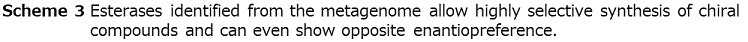 In addition to the example given in the introduction, we could show that the metagenome is a very rich source of novel biocatalysts even showing opposite enantioselectivity. For instance, we found 35 esterases / lipases originating from metagenome sources to be active and selective in the asymmetric hydrolysis of cis-3,5-diacetoxycyclopent-1-ene (Scheme 3)53). Subsequent analytical and laboratory scale biocatalysis reactions identified three enzymes showing excellent (-)-preference and one esterase with excellent (+)-selectivity. In another project, we were able to identify several hydrolases from the metagenome to be useful in the kinetic resolution of esters of tertiary alcohols54).