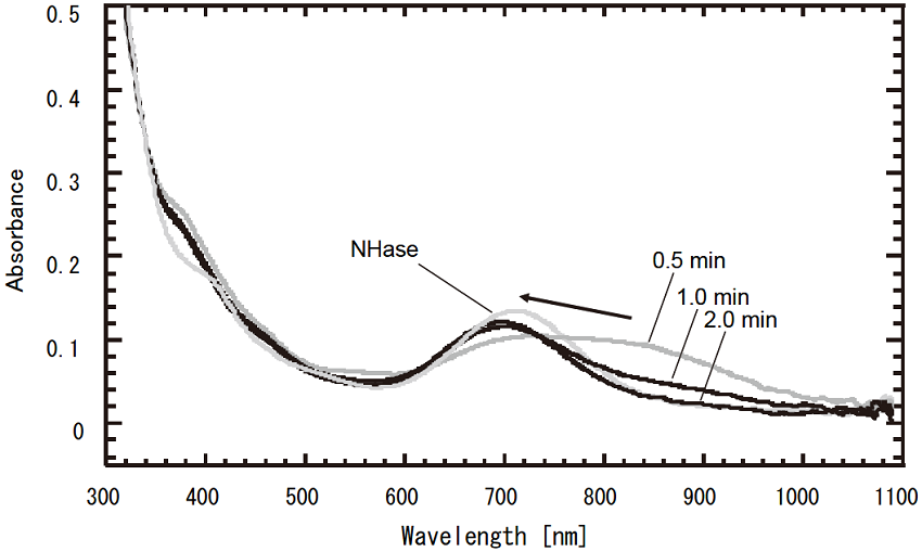 キネティクス測定から、tBuNC加水分解反応のKmはニトリル水和反応と同程度であるが、kcatは1.8×105倍小さい値であった。以上より、tBuNCは時間分割構造解析に適した基質であると期待された6,15)。