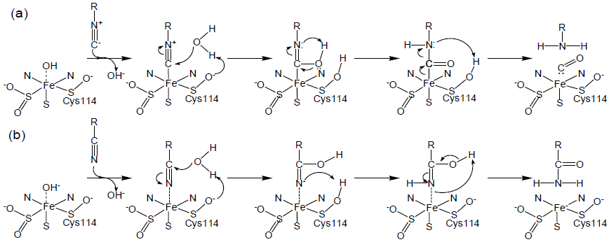 立体構造が明らかにされると反応機構がわかると思われるかもしれない。しかし、本酵素のように新規構造をもつ場合、むしろ、結晶構造の決定から反応機構研究が本格化する。最初の結晶構造をもとに3つの反応機構が提案された (図1(b)-(d))7)。 (b) と (c) は金属に配位した水分子が直接または近傍の水分子を活性化して基質ポケットに固定されたニトリル炭素原子を求核攻撃するモデルである。これに対し、 (d) では基質のニトリル基が金属イオンに直接配位して活性化され、近傍の水分子による求核攻撃を受ける。いずれの反応モデルにおいても、金属イオンはLewis酸として機能する。しかし、この段階では基質の結合様式すら明らかにされていなかった。