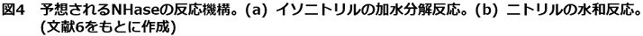 NHaseはRhodococcus、Pseudomonas、Nocardia等に属する多くの微生物から発見・単離されている。NHaseはアミダーゼと同一のオペロン中に存在しており、微生物学的には両酵素によるニトリル化合物の資化 (ニトリルをカルボン酸とアンモニアに分解し、炭素源・窒素源として利用する) を行うと考えられている。また、近年、NHaseの上流の反応を触媒する酵素として、アルドキシムからニトリルを合成する反応を促進するアルドキシム脱水酵素が浅野ら2) と小林 (筑波大) ら3) によって独立に報告され、「アルドキシム-ニトリル経路」の存在が明らかにされ、注目されている。