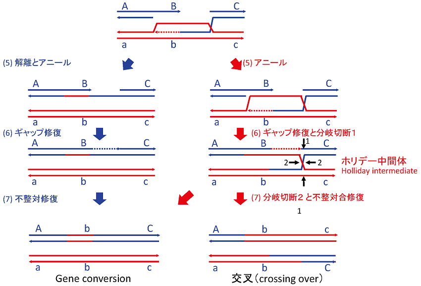 回復したDNA配列をもつ単鎖DNA部分が鋳型から離れて、切断の相手端にできた単鎖DNA部分の相補配列とアニールすると切断の両側の連続性を回復する (図3;左側第5段階)。残った単鎖ギャップが第2の修復DNA合成で埋められるとDNA二重鎖切断修復が完了する (図3;左側第6段階)。鋳型DNAをコピーした部分が対立遺伝子bなのでA-TまたはG-Cではない不整対 (mismatch) が残るが、それが対立遺伝子bの配列に従って修復される (図3;左側第7段階) と鋳型DNAの遺伝情報が組み込まれた組換え体 (A-b-C) として識別される。このように一対の親DNA (A-B-C : a-b-c) の一方だけが相手の遺伝情報で置き換えられる組換え (A-b-C : a-b-c) をgene conversion*2という (図1)。一対の親DNAの間でDNA部分を交換する (A-C : a-c →A-c: a-C) 交叉 (crossing over; 図1) は、ホリデー中間体を経て行われる (図3;右側段階5から7)4,5)。