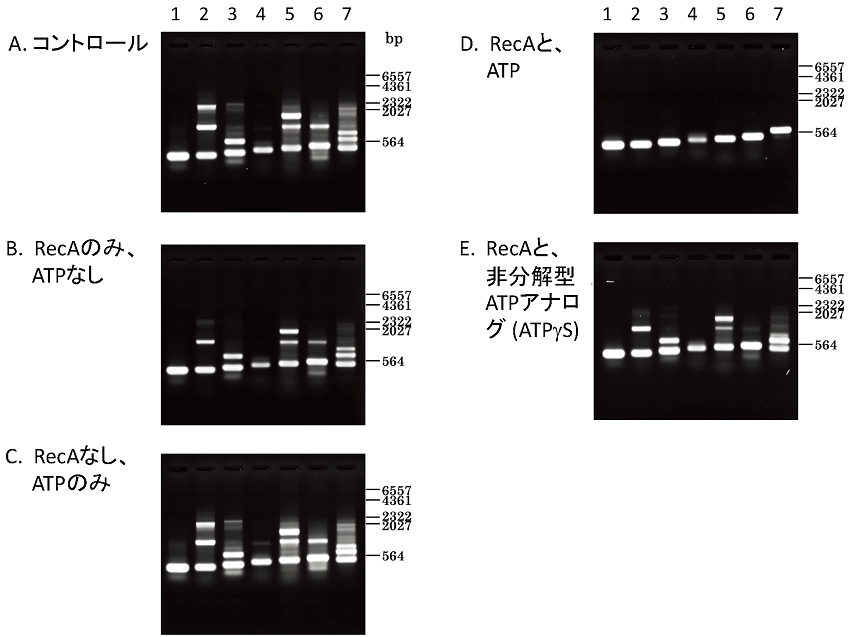 真正細菌や真核生物の核での相同対合は全てRecA/Rad51を必要とするが、ミトコンドリア (ヒト 16 kbp;出芽酵母 75-85 kbp) やDNAウイルスでは、RecA/Rad51型蛋白質を必要とせず、ATP不要型相同対合蛋白質だけで相同組換えが起きる例が知られている。これらは共通にゲノムサイズが小さいことを考慮すると、真正細菌 (4 Mbp) 以上の大きなゲノムDNAでは、ATP不要型相同対合蛋白質が先ず荒く相補塩基配列を探し出し、RecA/Rad51が、ATP分解によるエネルギーを利用した反応で不整対をもつヘテロ二重鎖を解離することで、高精度相同対合を行っているのだろう。以下の2つのRecAの機能はこの仮説を支持する。先ず、は相同領域長が十分に無い (数kb以下) とATP分解に依存した反応で、できたDループを解離する (Dループサイクル)15)。また、PCRによってDNAを増幅する時に、反応系へ熱耐性RecAを添加するとそのATP分解に依存した活性で非特異的副産物生成が効果的に抑制できる (図4)16,17)。