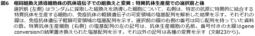 相同組換えによる新機能をもつ蛋白質創出への第一歩がADLib法の発明である。相同組換え率は、高い減数分裂期酵母細胞でも10-2レベル以下であり、高等動物細胞の相同組換えはそれよりはるかに低い。酵母の相同組換え開始制御の仕組みについての研究から、組換え開始に先立って、二重鎖切断が起きるDNA部位でヒストンのアセチル化が亢進して染色体が再編成されることが分った22)。瀬尾と太田らは、奇想天外な発展として、ニワトリのB細胞由来株化細胞をヒストン脱アセチル化酵素阻害剤で処理してみた。驚いたことに、核細胞当たり、ほぼ100%という超高頻度で免疫抗体遺伝子可変領域の相同組換えを誘導できた。さらに、抗原を結合させた磁気ビーズによって、その抗原に特異的に結合する抗体を生産する細胞を、組換え誘導処理細胞群の中から釣り上げ、1週間程度でクローン化とその抗体の多量生産ができた (ADLib法: http://www.jst.go.jp/pr/announce/20050530/index.html)23,24)。動物体を使わないこの手法は自己抗原など異物と認識されにくい困難抗原の抗体を取得する実績も挙げている。トリは、ヒトと異なり可変領域のカセットが軽鎖、重鎖それぞれに一つしかなく、代わりに可変領域に似た塩基配列を数十も含むクラスターがありそれを鋳型とするgene conversion型相同組換えによって多様な抗原特異性を獲得するといわれていた。ところが、実際に相同組換えの誘導で新規の特異性をもつ抗体を作らせたのは、これが初めてである。ヒストン脱アセチル化酵素阻害剤処理では相同組換えと共に、突然変異も同程度に誘導されるが、特異抗体を生産する細胞の可変領域はほぼ全て相同組換えでできており、突然変異の寄与はほとんどなかった (図6)23)。この相同組換えは、ヘテロ二重鎖に10%程度の不整対を含む必要があり、RecA/Rad51型蛋白質による不整対排除機能は抑制されていると考えられる。ADLib法の原理は抗体を超えて広く新規蛋白質創出に応用できるであろう。