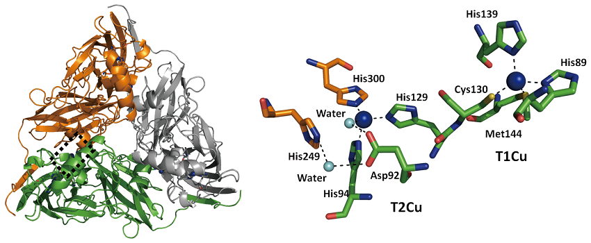 これまでに結晶構造が報告されている6 種類の CuNIR9-14) は、Hyphomicrobium種の六量体CuNIR13) を除くすべて、2種類の銅イオン (タイプ1銅とタイプ2銅) を1個ずつ結合したサブユニット3つからなる三量体構造 (分子量11 万で銅を合計6個含む) をとっている (図1)。分子量約3.7万のサブユニット単体は、約8本のβ鎖の束からなるβ-バレル構造 (キュプレドキシン-ホールドともいう) を2つ持った構造をしている。また、銅部位においてはいずれも歪んだ四面体四配位のタイプ1銅とタイプ2銅が、-ヒスチジン残基 (His129) -システイン残基 (Cys130) -のアミノ酸残基によって架橋され、約12.5Å離れて位置している。さらに、タイプ2銅の周りには[タイプ2銅配位水分子-アスパラギン酸残基 (Asp92) -水分子-ヒスチジン残基 (His249) ]の水素結合ネットワークがあり、基質 (NO2-) へのプロトン供給を担っている。本酵素はまず、タイプ1銅部位で電子供与 (伝達) 蛋白質から電子を受け取り、His-Cys架橋構造を経由した蛋白質内電子移動によりタイプ2銅に電子を送る。次に還元されたタイプ2銅部位でNO2-がNOに還元されて触媒反応が進行する。