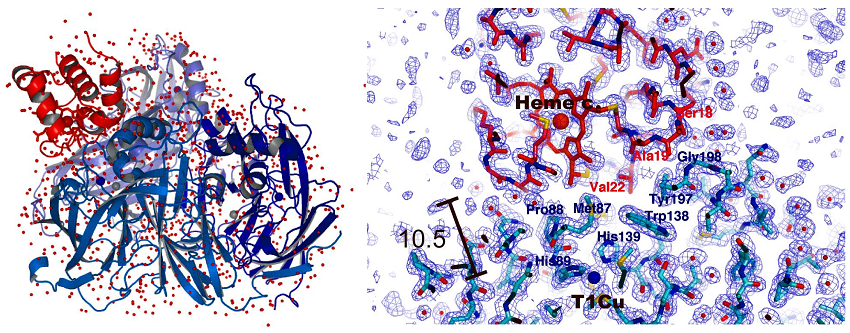 生体中における様々な蛋白質電子伝達機構のうち特にその解析が困難とされているのが、電子伝達蛋白質として機能するチトクロムc、ブルー銅蛋白質 (キュプレドキシン)、フェレドキシン、フラボドキシン等といった比較的小さな蛋白質と各種酸化還元酵素の間で起こる "蛋白質分子間電子伝達反応" である。一般に、電子伝達パートナー分子同士によって形成される過渡的な複合体は弱く短寿命な一過性のものであり、それは生体中において分子間電子伝達反応を効率よく繰り返し行うために必要な物理化学的特性である。しかしながら、その不安定さからこれまでに複合体形成時の立体構造を高分解能で解析した例は非常に少なく (プロテイン・データ・バンク (PDB) にも十数例しかない)、その反応メカニズムを詳細に理解することは難しく且つ非常に興味深い研究対象とされている。