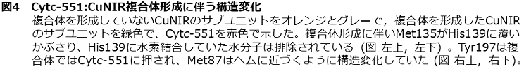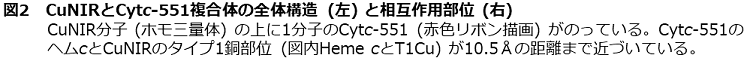 CuNIRへ電子を供給する電子伝達蛋白質 (酸化還元パートナー) は何か?この問いに対する答えは、初めてCuNIRの結晶構造が解かれた1991年から現在に至るまで複数の研究グループにより様々な説が唱えられている。CuNIRを持つ脱窒菌株種によっても異なるが、最も研究が進んでいるものは、ブルー銅蛋白質のシュードアズリン (PAz) とアズリン (Az)、そしてヘム蛋白質のチトクロムcで (Cytc) である。特に、脱窒菌Achromobacter xylosoxidans (Axと略す) においては、Azを唱えているグループとCytc-551を主張している当グループとで長年の間、論争を繰り広げてきており、今回のAx由来のCuNIRとCytc-551の過渡的電子伝達複合体の結晶構造解析に成功したこと15) と、さらにAz、Cytc-551、そしてCuNIRを組み合わせた電子移動反応の速度論的解析16) から、その終止符を打つことができたと考えている。