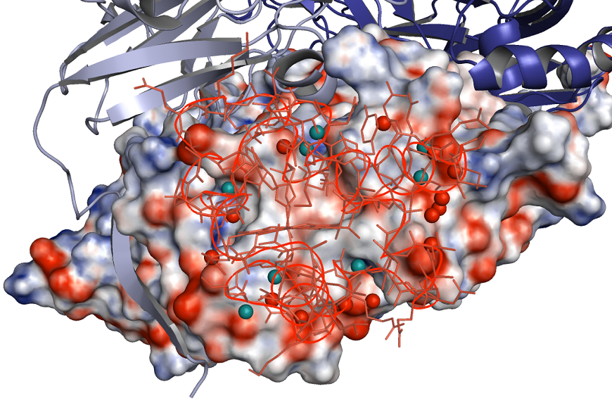 これまで単独の構造解析からCytc-551のヘム近傍表面とCuNIRのタイプ1銅近傍表面には小さな疎水性領域 (パッチ) があり水分子がまばらに点在することがわかっていたが、興味深いことに、それらの水分子は複合体を形成することで相互作用境界面の中心 (コア) から排除されていた (図3)。これは、お互いの相互作用部位に疎水的アミノ酸残基を多くすることでその部位表面での水分子の数を減らし、分子間相互作用時の水分子排除に係るエネルギーロスを最小限にしながらお互いの酸化還元中心を最も接近させるといった、生物が進化の歴史を経て獲得した分子間電子伝達反応機構における分子戦略なのかもしれない。