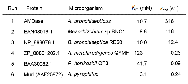 A. bronchisepticusのゲノムDNAからショットガンクローニング法により、AMDaseと推定される遺伝子を取得した。720 bpのORFがコードするタンパク質の分子量は24,737 Daであり、精製したAMDaseのSDS-PAGEの結果 (24 kDa) とよく一致した。また、ORFより推定されるタンパク質のN末端配列は、精製酵素から決定した配列と完全に一致した7)。以上の結果から、本ORFがAMDaseをコードしていると判断した。また、大腸菌において全タンパク質の30%以上にも達する過剰発現にも成功し、野生株では発現量の少なかった酵素を大量に得ることが可能となった。