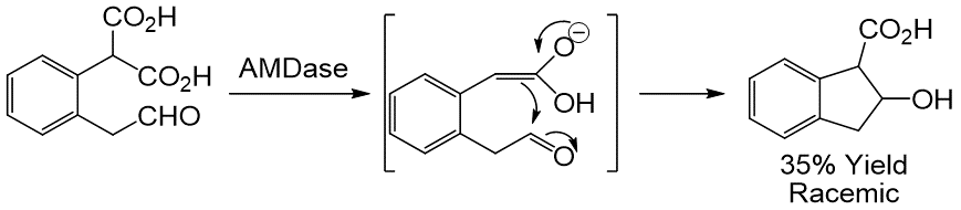 ここまでの検討から脱炭酸反応の過程でエノール型中間体の存在が強く示唆された。そこで、エノール中間体の近傍に求電子剤であるアルデヒドが存在すると、アルドール反応が進行するのではないかと考えた。そこで、反応系にアセトアルデヒド等のアクセプター分子を共存させてみたが、アルドール生成物を確認することができなかった。そこで、中間体の近傍にアルデヒド基が確実に位置するように、フェニルマロン酸の分子内にアルデヒド基を導入した基質をデザインした (図3)。そして、実際に基質を合成し反応を試みた結果、収率は35%であったが期待するアルドール生成物が得られ、エノール中間体を求電子剤でトラップすることに成功した10)。エノール中間体の寿命は短いと考えられるので、アルドール反応は酵素の活性部位内で起こっていると考えた。したがって、酵素の活性中心というキラルな空間内での反応なので、何らかの選択性を伴って進行しているものと期待した。しかし、アルドール生成物を分析したところ残念ながらラセミ体であった。