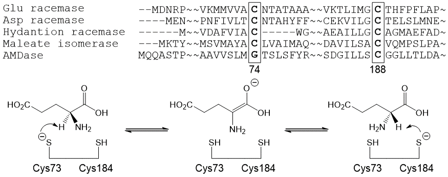 AMDaseの配列を用いてホモロジー検索を実施したところ、アミノ酸ラセマーゼや各種イソメラーゼと低いながらも相同性を示した (図4)。アミノ酸ラセマーゼに関しては詳細な反応機構が解明されており、2つのシステインが共同してプロトンの引き抜きと供与を行う二塩基機構が提唱されている。AMDaseとラセマーゼの配列を比較すると、AMDaseの活性中心にはシステインがひと一つしか存在しないことがわかる。そこで、エノール中間体に対して一方の面からのみシステインがプロトン供与を行い、光学活性なカルボン酸が生成するのではないかと推定した。