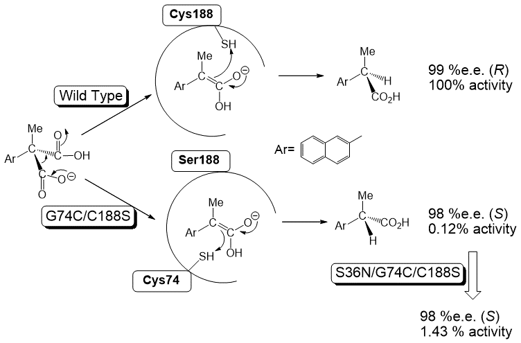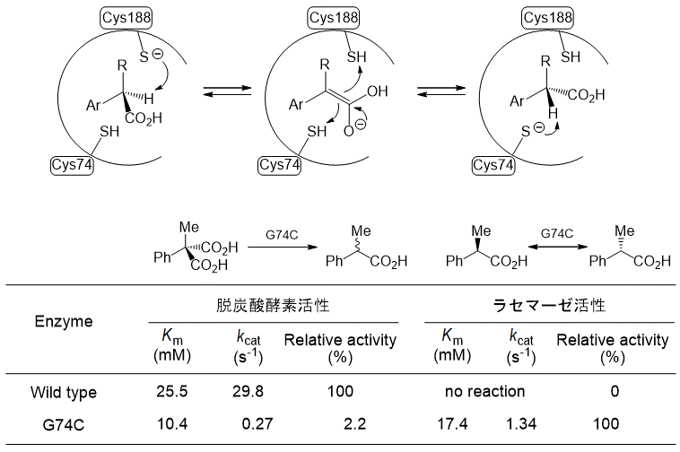 最近、我々のグループ14,15)と他のグループ16,18)は独立にAMDaseのX線結晶構造解析に成功した。我々は、野生型AMDaseだけではなく変異型についてもリガンドが結合した構造の解析に成功した。その結果、野生型と変異型の活性部位は、ほとんど変化がないことが分かった。また、リガンドが結合することにより活性部位の上に疎水性部位が生成し、基質が活性部位に結合することにより、開いた構造から閉じた構造に変化することが推定できた。そして、代表的な基質であるα-メチル-α-フェニルマロン酸を用いて結合モデルを作成し、反応機構を考察した。その結果、G74, L77, Y48の各残基によって構成される小さな疎水性ポケットによって一方のカルボキシル基が不安定化されて、それがトリガーとなり脱炭酸反応が始まる。そして、生成したエノール型中間体に対して188番目 (G74C/C188S変異体では74番目) のシステインがプロトン供与を行い、光学活性カルボン酸が生成するという反応メカニズムを推定した。
