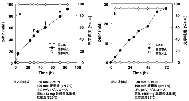 Streptomyces sp. GF3587とGF3546の培養および反応条件を検討した後、休止菌体を調製し、菌体による2-MPNの不斉還元反応を試みた。本反応には、エネルギー源が必要であり、補酵素再生のためにグルコースを反応系に添加した。その結果、GF3587菌体は、100 mM 2-MPNから91 mM (7.7 g/L) (R)-2-MPを99.2%e.e.の光学純度で生成し (図2a)、GF3546菌体は、30 mM 2-MPNから27 mM (2.3 g/L) (S)-2-MPを92.3%e.e.の光学純度で生成した10)(図2b)。この変換反応を経時的に追跡したところ、光学純度に変動はなく、高い光学純度が維持されていた。