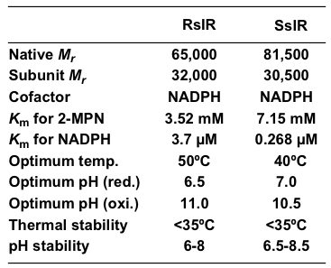 Streptomyces sp. GF3587の (R)-選択的イミン還元酵素 (RIR) とStreptomyces sp. GF3546の (S)-選択的イミン還元酵素 (SIR) は、どちらも菌体内に存在する構成酵素であった。菌体を破砕後、無細胞抽出液を調製し、硫安分画、各種クロマトグラフィーを経て精製を行い、RIRとSIRの双方の均一な精製酵素標品が得られた。RIRとSIRのサブユニット分子量は、SDS-PAGEからそれぞれ32,000、30,500と算出された (図3)。またHPLCゲルろ過の結果から、両酵素ともホモ2量体を形成していることが示唆された。RIRとSIRは、どちらも補酵素としてNADPHを要求する還元酵素であった。補酵素存在下、種々のpHにおける両酵素の活性を調べたところ、pH 7付近では2-MPNの還元を触媒する一方、pH 10付近では2-MPの酸化を触媒した。ただし、最適反応条件下では、RIRとSIRの還元活性は、酸化活性に比べて、それぞれ約30倍、約4倍高いことが分かった。最適pHや最適温度などRIRとSIRの諸性質については、表2に示した11)。