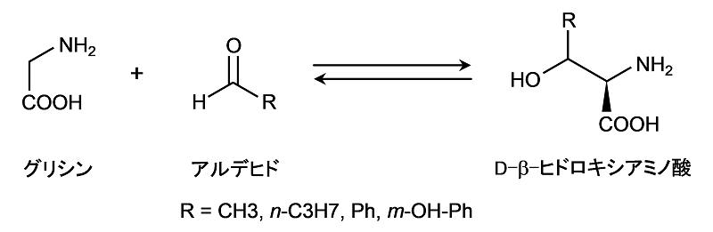 D-アミノ酸を不斉合成する酵素は存在自体が稀であり、これまで見出されてきた酵素の種類も限られている。その中のひとつにD-スレオニンアルドラーゼ (以下D-TAと略す) がある。D-TAは、ピリドキサール-5-リン酸を補酵素とし、Mg2+、Mn2+のような2価の金属イオンを要求する酵素で、グリシンとアセトアルデヒドからD-スレオニンへのアルドール縮合反応を可逆的に触媒する4-8)。D-TAの立体制御は合成反応において、ヒドロキシル基を有するβ位に対して曖昧である一方、α位では厳密でd体に選択的である。既知のD-TAは基質特異性が比較的広く、グリシンと各種アルデヒドを基質に、対応するD-β-ヒドロキシアミノ酸を合成し、逆の分解反応も触媒することが知られている (図2)。このD-TAの広い基質特異性を活かし、入手が容易かつ安価な原料であるグリシンとホルムアルデヒドからD-セリンを直接合成することができれば、革新的な合成方法を開発することができる。しかしながら、D-TAは広い基質特異性を有することが知られているにもかかわらず、Arthrobactersp. DK-38由来のD-TAはD-セリンに作用しないことが示されており8)、D-セリンの合成反応を触媒するD-TAについてはこれまで報告がなかった。