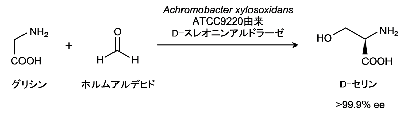D-セリンは、L-アミノアシラーゼを用いた酵素的光学分割法により合成されていた2,3)。N-アセチル-DL-セリンを調製し、L-アミノアシラーゼでL体のみを特異的に脱アセチル化する。次に、N-アセチル-D-セリンを分離精製し、脱アセチル化することでD-セリンを得ている。この方法は前述の通り、理論収率が50%と低く、多工程となってしまうため、経済性に優れているとは言い難かった。