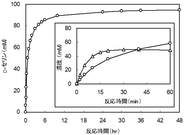 そこで、我々は、D-セリン合成活性を有するD-TAを見出すために、種々の細菌からスクリーニングを実施した。既知D-TA遺伝子のDNA配列のアライメントを作成し、保存配列に基づいてデザインしたプライマーを用いて、ゲノムPCR法によりD-TA遺伝子の探索を行った。その結果、Achromobacter ylosoxidans ATCC 9220 (以下Axと略す) から新規なD-TA遺伝子を取得することができた9)。本遺伝子のORFは1,140塩基で、379アミノ酸からなるタンパク質をコードしていると推定された。本酵素のアミノ酸配列は、D-セリンに作用しないことが報告されているA. sp. DK-38由来D-TAのアミノ酸配列に対して88%と高い相同性を示した。次に、我々が取得した新規D-TAが標的とするD-セリン合成活性を有するか評価するために、まずAx由来D-TA遺伝子を高発現する組換え大腸菌を作製した。続いて、大腸菌から組換えD-TA酵素を精製して、グリシンとホルムアルデヒドを基質とした合成反応を行った結果、生成物としてD-セリンが検出された。また、この合成反応では、L-セリンが全く検出されず、D-セリンの光学純度は99.9%ee以上であった。図3に示すように、Ax由来D-TAが極めて高い立体選択性を有するD-セリン直接合成酵素であることを見出した。本酵素はグリシンとアセトアルデヒドを基質としたD-スレオニンへの変換反応も触媒する。生成物のD-スレオニンは、スレオ体とエリスロ体のほぼ1:1のジアステレオマー混合体であり、既知のD-TA同様、その立体選択性はα位で厳密であるが、β位では極めて低かった。さらに、精製酵素を用いて、D-セリンとD-スレオニンの合成反応を行った。グリシンとアルデヒドの濃度をそれぞれ100 mMとして反応させたところ、初速はD-セリン合成の方が遅いという結果となった。しかしながら、反応収率を見てみるとD-スレオニン合成が50%程度に留まったのに対して、D-セリン合成では95%にまで達した (図4)。また、逆反応の試験ではAx由来D-TAがD-セリンの分解活性を示したことから、A. sp. DK-38由来のD-TAとは異なる基質特異性を有していることが明らかとなった。以上のように、新規Ax由来D-TAは高収率かつ高立体選択的にD-セリンを直接合成することから、 D-セリンの工業的生産に適した酵素であると言える。