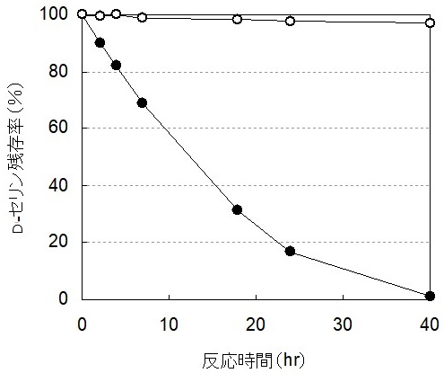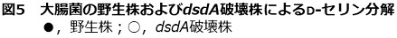 工業生産では、酵素の精製は操作が煩雑で経済面で不利である。したがって、触媒にはAx由来D-TA遺伝子を高発現する組換え大腸菌を細胞のまま用いることとした。本組換え大腸菌を触媒として実際にD-セリンの合成反応を行ったところ反応収率は90%となり、精製酵素を用いた場合の95%を下回った。収率低下の原因は、生命システム情報統合データベース (KEGG) の解析から、大腸菌が元々保有するD-セリン分解酵素、すなわちD-セリンデヒドラターゼにより生成したD-セリンがピルビン酸に分解してしまうためであると推測された。そこで、大腸菌触媒でより高い反応収率を達成するために、D-セリンを分解している可能性がある大腸菌内のD-セリンデヒドラターゼ遺伝子 (dsdA) を破壊することとした。相同組換えを利用した遺伝子破壊法10) を用いて、ゲノムからdsdAを取り除いた遺伝子破壊大腸菌を構築し、はじめにD-セリンの分解能を評価した。大腸菌の野生株とdsdA破壊株それぞれを50 mMのD-セリンに作用させたところ、野生型では40時間でほぼ完全にD-セリンが分解されたのに対し、dsdA破壊株ではほとんどのD-セリンが残存する結果なった (図5)。大腸菌の野生株はD-セリン分解活性を保有するが、dsdAを破壊することでその分解活性を抑制できることを明らかにした。dsdA破壊株をAx由来D-TA遺伝子で形質転換し、これを触媒としてD-セリン合成反応を行ったところ、反応収率は95%に達した。組換え大腸菌を細胞のまま触媒として用いても、精製酵素と同様の高収率を実現することに成功した。
