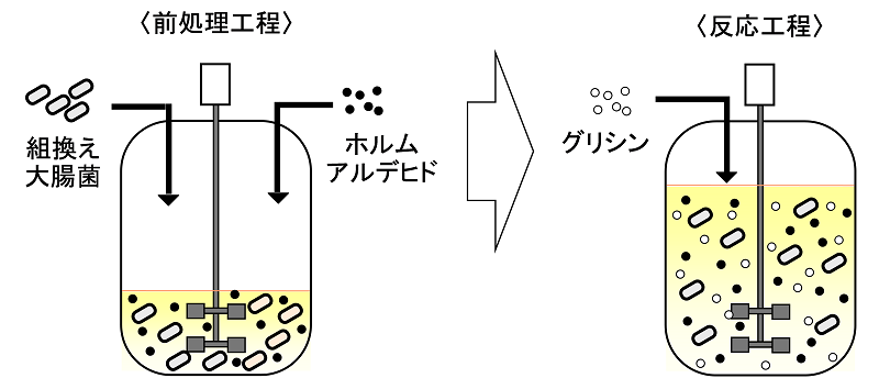 我々は、D-TAの基質特異性が比較的広いことに着目し、D-セリンを直接合成する酵素、Ax由来D-TAを見出すことに成功し、その性質を明らかにした。続いて、本D-TA遺伝子の組換え大腸菌を用いたD-セリンの工業的生産プロセスの開発を試みたが反応収率、光学純度の低下を招いた。しかしながら、遺伝子破壊ならびに有機溶媒による前処理といった技術を駆使し、これら課題を解決することにより、組換え大腸菌触媒でも高収率かつ高光学純度を実現できる革新的な製造方法を開発するに至った。特に、反応工程で基質となるホルムアルデヒドをL-セリン合成関連酵素の失活剤として利用し、目的物のD-セリンへと変換させることで無駄なく効率の良いプロセスを実現したことは、本技術の優れた点の一つである。以上のように、工業生産では高性能な触媒に加え、合理的なプロセスを開発することが重要となってくる。本稿で紹介したような課題解決の概念や手法が、製造法の開発を検討される際の参考となれば幸いである。