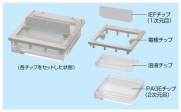 自動化することによって、操作の簡便性と分離結果の再現性の向上を目指しました。分析毎に使用する分離ゲル類は、ディスポーザブルのサプライ品として供給します。片手で扱いやすいサイズ70 mm角の樹脂製 (従来法は100~250 mm角程度のガラス板製) のチップとし、その内部に分離ゲルを封入した気密包装ですので、開封して直ぐに装置にセットできます。分析する試料と試薬類を投入しスタートすると、その後はすべて「Auto2D」が自動でおこないますので、約100分後には2次元分離が完了しています。従来法では、途中で何度か煩雑な作業が必要なため、常に次の作業タイミングを気にしながら2日掛かりの分析となりますので、自動化により簡便性は格段に進化したと言えます。