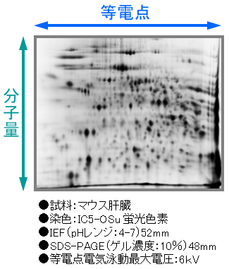 最終的には、矩形シート状の2次元目分離用ゲルに、網羅的に分離された数多くのタンパク質がそれぞれ異なるスポットに収束して分布します。そのスポットの2次元的な位置関係や濃度が各々のタンパク質の分析情報となります。