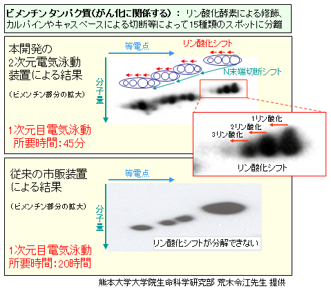 今回開発した装置は、全自動かつ短時間で2次元電気泳動結果をもたらします。これにより、大量の臨床データを処理することが必要であった疾病プロテオミクス分野でも、広く2次元電気泳動法を用いることが可能となります。さらに、医学研究のみならず、製薬業界や食品検査等でタンパク質を網羅的に分析する場合や、微細な化学変化を含む分析が必要とされる分野でも、本開発成果の利用が期待されます。