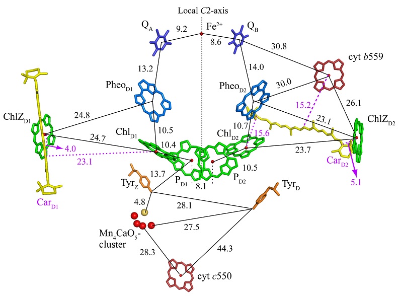 PSIIでは、反応中心のクロロフィルにおいて光エネルギーを吸収し、一連の電子伝達反応を行っている。その電子伝達系の配置を図2に示す。これらの電子伝達成分は、D1, D2と呼ばれる2つの反応中心サブユニットに結合しており、左右で疑似2回対称性を持つ2本のブランチを形成しているが、電子伝達は、左側のD1ブランチでのみ行われる。このような電子伝達活性の非対称性には、左側の水分解触媒のMn4CaO5クラスターの存在 (後述)、反応中心におけるクロロフィル配置の非対称性1)、およびD1, D2両サブユニットのいくつかの対称的な位置でのアミノ酸の相違1,3) などの因子が寄与していると思われる。