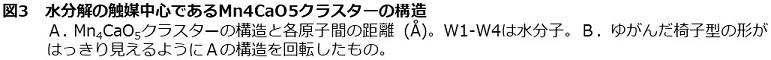 上記の水分解反応を直接触媒しているMn4CaO5クラスターは、これまで長い間詳細な構造が不明であった。1.9 Å分解能において、この構造をはっきりと同定することができ、Mn4CaO5という化学式であることが初めて明らかになった (図3)。解析されたMn4CaO5クラスター構造の最大の特徴は、ゆがんだ椅子型であるということが言える。このうち、3つのMn,1つのCa,4つのオキソ酸素が歪んだキュバン型の座部を作り、4つ目のMnはその椅子の外側にあり、オキソ酸素を通してつながっている。